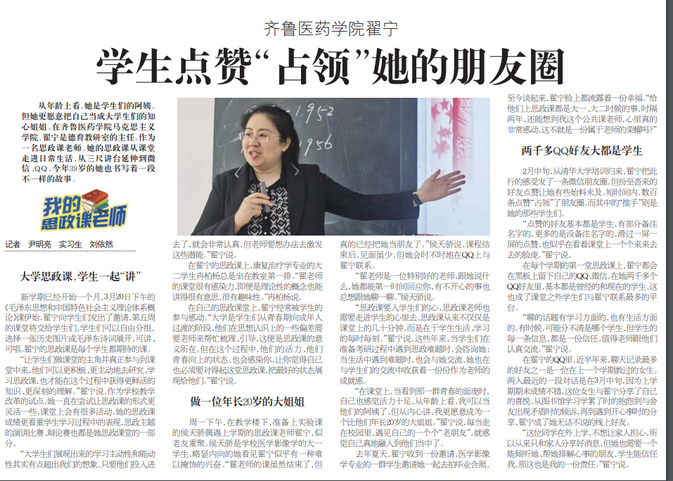 從年齡上看,她是學(xué)生們的阿姨,但她更愿意把自己當(dāng)成大學(xué)生們的知心姐姐。在齊魯醫(yī)藥學(xué)院馬克思主義學(xué)院,翟寧是德育教研室的主任。作為一名思政課老師,她的思政課從課堂走進(jìn)日常生活,從三尺講臺延伸到微信、QQ,今年39歲的她也書寫著一段不一樣的故事。