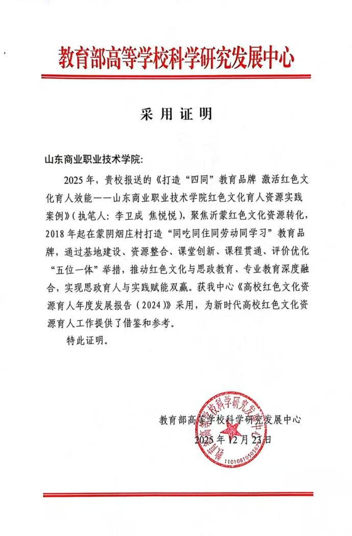 近日,山東商職學(xué)院報送的《打造“四同”教育品牌 激活紅色文化育人效能——山東商業(yè)職業(yè)技術(shù)學(xué)院紅色文化育人資源實踐案例》成功入選教育部高等學(xué)校科學(xué)研究發(fā)展中心《高校紅色文化資源育人年度發(fā)展報告(2024)》,為新時代高校紅色文化資源育人工作提供了借鑒和參考。