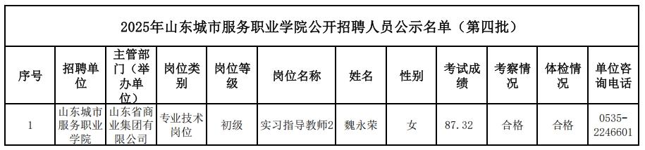 根據(jù)中共山東省委組織部、山東省人力資源和社會(huì)保障廳關(guān)于印發(fā)《2025年省屬事業(yè)單位公開(kāi)招聘工作實(shí)施方案的通知》(魯人社發(fā)〔2024〕15號(hào))要求等相關(guān)規(guī)定,山東城市服務(wù)職業(yè)學(xué)院經(jīng)過(guò)公開(kāi)招聘報(bào)名、考試、考察、體檢等工作,現(xiàn)對(duì)擬聘用人員(第四批)進(jìn)行公示,公示期為5個(gè)工作日,自2025年8月5日至2025年8月11日(不含節(jié)假日)。公示期間,如對(duì)公示人選有異議,請(qǐng)及時(shí)向山東省商業(yè)集團(tuán)有限公司反映。